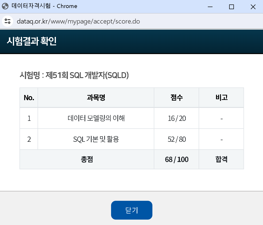 저는 데이터 모델링의 이해 부분에서 16점, SQL 기본 및 활용에서 52점을 취득해 총점 68점으로 합격했습니다.