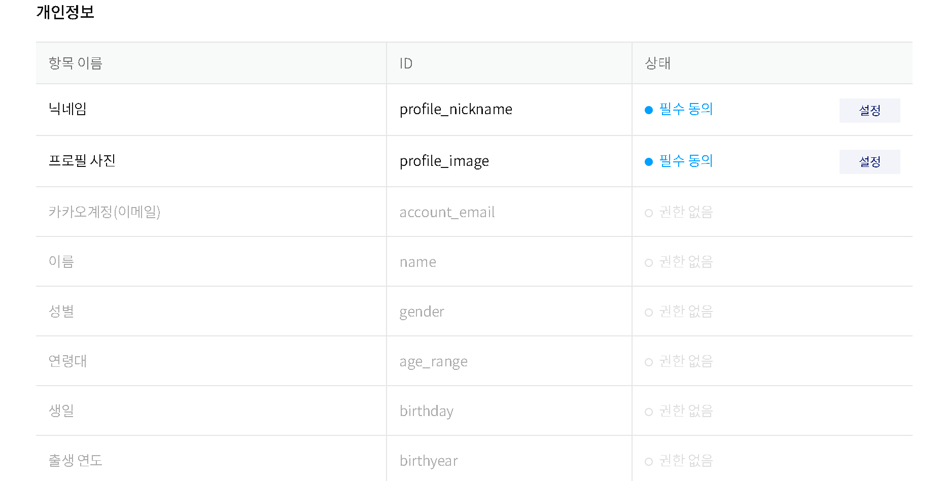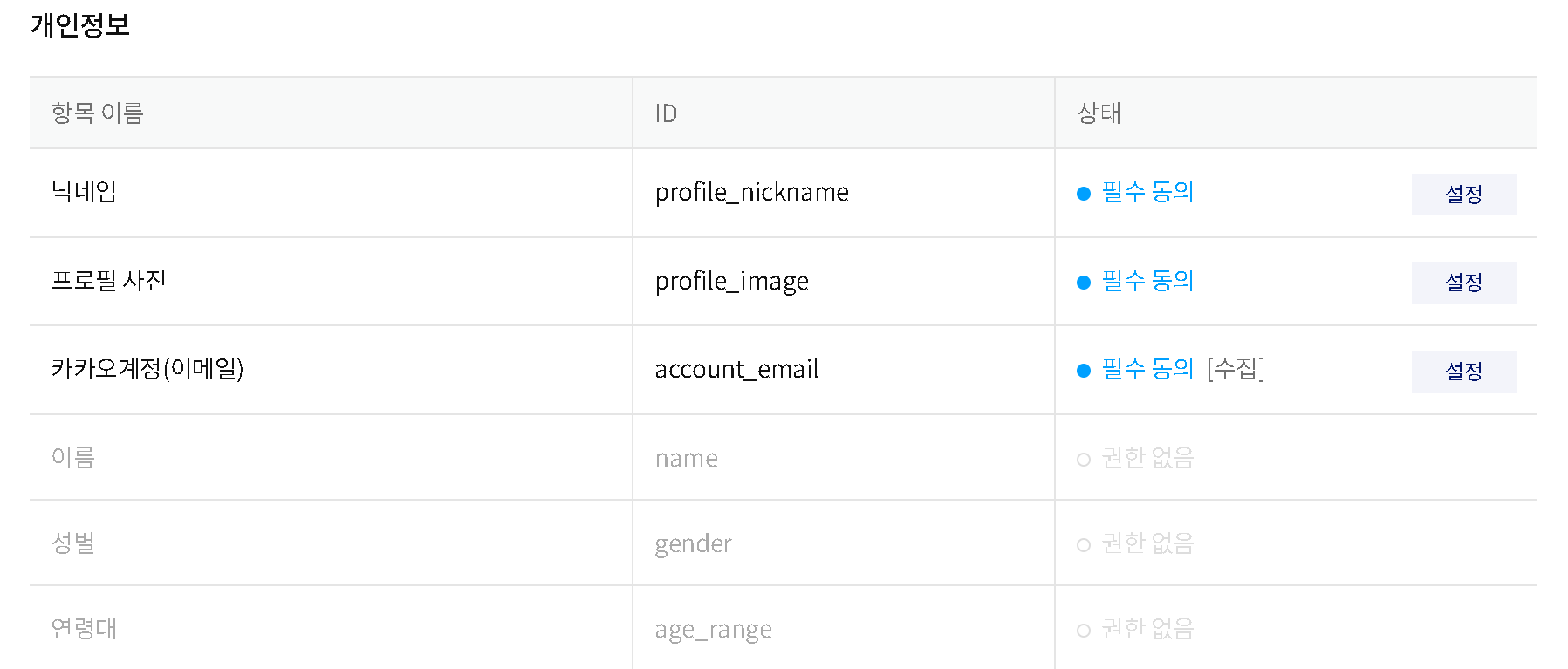 제품 설정 > 카카오 로그인 > 동의 항목 페이지에 가서 카카오 로그인을 할 때 수집할 정보들에 대한 설정을 해줘야 합니다. 일반적인 상황에서 필수 동의가 가능한 정보는 닉네임과 프로필 사진입니다. 하지만 추후 jwt 토큰을 생성할 때 이메일 정보를 활용할 예정이기 때문에 카카오 계정 이메일 정보도 수집 가능하도록 설정해보겠습니다.