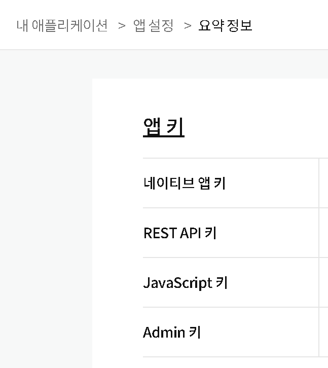 앱설정 > 요약정보 페이지에 서 REST API 키를 복사해 둡니다.