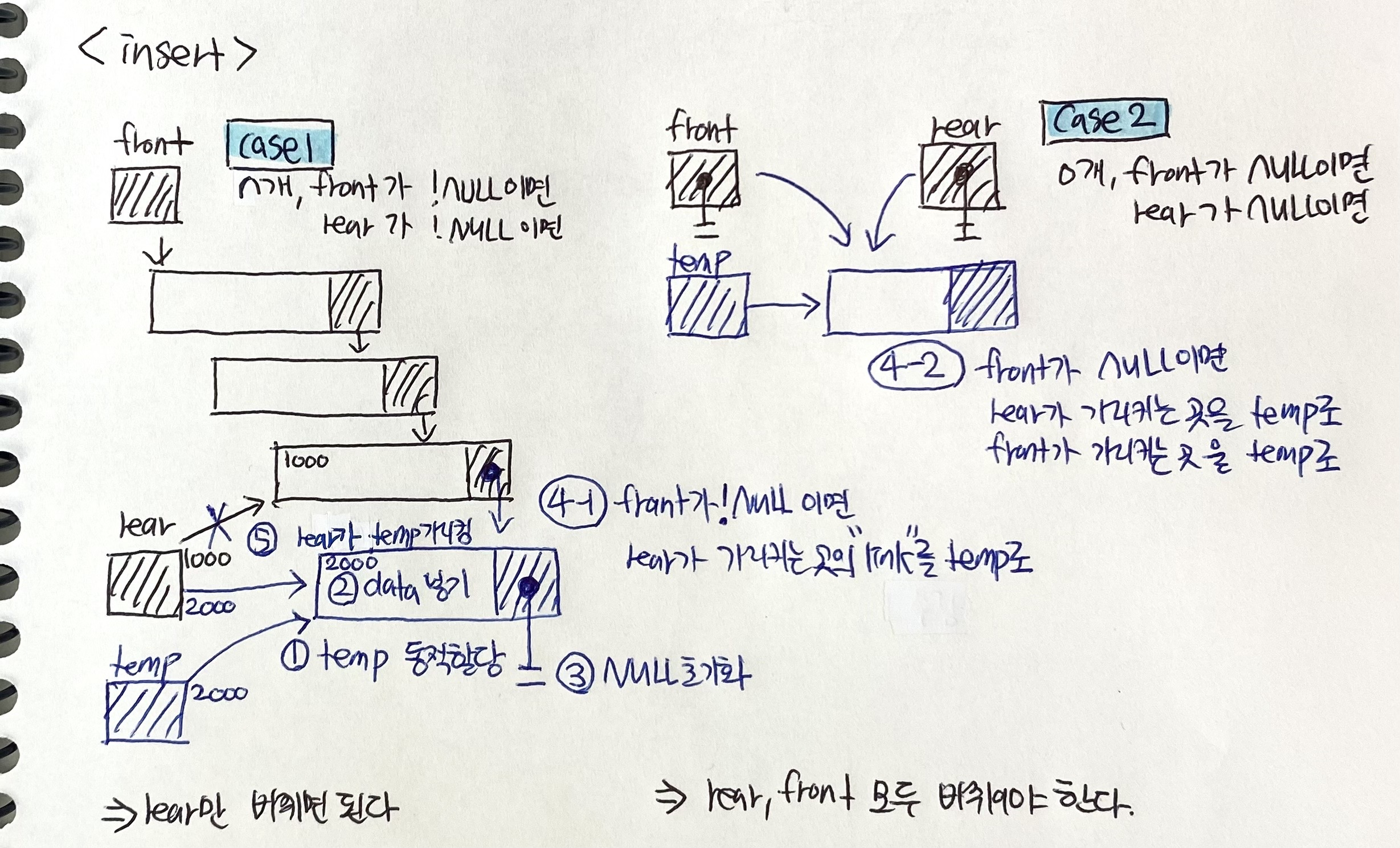 4-2. front가 NULL이며 rear가 가리키는 곳을 temp로, front가 가리키는 곳을 temp로
