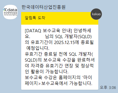 [SQLD] SQL 개발자 보수교육 어느 날, SQLD 자격증 보수교육을 받으라는 문자가 도착했다.SQLD 자격증은 취득 후 1년 6개월이 지나면 보수교육을 이수해 자격증의 유효기간을 영구로 전환할 수 있다. https://www.dataq.or.kr/www/mypage/reedu/list.do 데이터자격검정 - 데이터자격시험, DAP, DAsP, SQLP, SQLD, ADP, ADsP.데이터자격시험, DAP, DAsP, SQLP, SQLD, ADP, ADsP.www.dataq.or.kr 해당 사이트에 접속한 후 마이페이지 → 보수교육 메뉴로 들어가면 보수교육을 진행할 수 있다. 교육을 완료하면 ‘교육완료’ 인덱스에서 보수교육 완료 여부를 확인할 수 있다. 처음엔 교육을 다 들었는데도 완료 표시가 뜨지..
