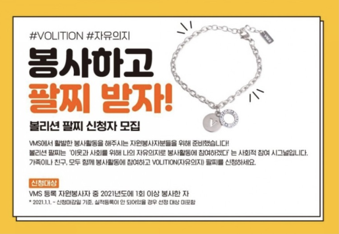 [ VMS 볼리션 팔찌 ] 봉사활동도 하고 팔찌도 받고~! 사회복지자원봉사인증관리시스템에서 2021년 한 해 동안 1회 이상 봉사한 사람들을 대상으로 볼리션 팔찌를 주고 있습니다. 볼리션은 자유의지라는 뜻으로 '이웃과 사회를 위해 나의 자유의지로 봉사활동에 참여하겠다'는 사회적 참여 시그널입니다. 사회봉사도 하고 의미 있는 팔찌도 얻을 수 있는 이벤트에 지원해보시길 바랍니다. 볼리션 팔찌 신청자 모집 VMS에서 활발하게 봉사활동을 하는 자원봉사자분들을 위해 준비했다. VMS 홈페이지에 들어가시면 자세한 정보를 볼 수 있습니다. VMS는 사회복지 자원봉사 인증 관리 시스템으로 여러 가지 봉사활동 안내를 받을 수 있습니다. 또한 봉사활동 관련된 알림을 받을 수 있습니다. 그리고 봉사활동 신청 하기에도 적합한..